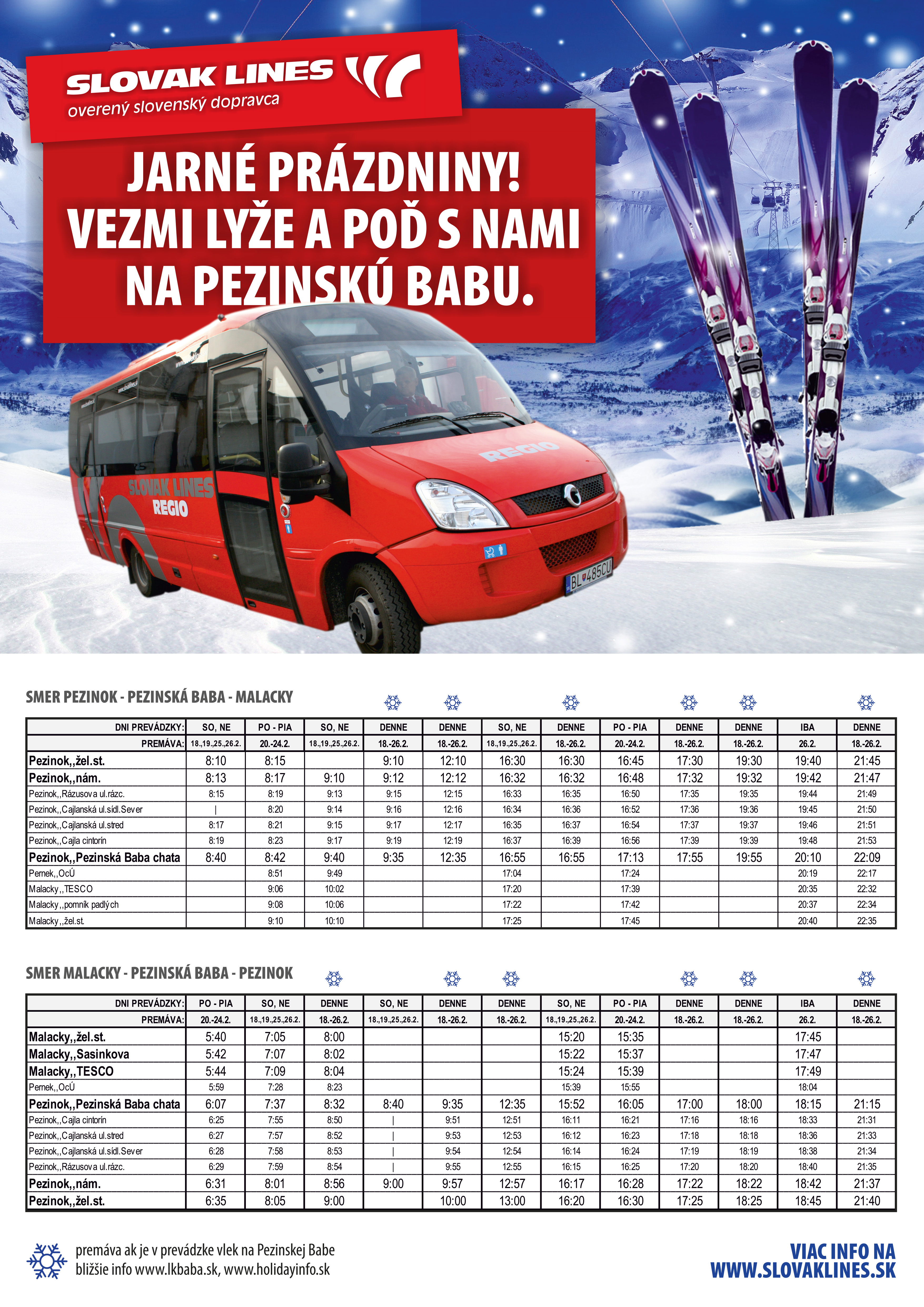 V prípade priaznivých snehových podmienok budú v čase jarných školských prázdnin od 18.2 - 26.2.2017 vedené mimoriadne spoje na Pezinskú Babu